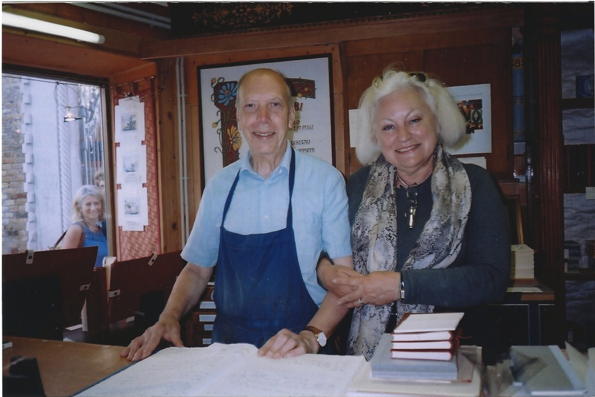 Gianni Basso, world renowned printer in Venice, with Ian. Basso prints by hand with old machinery.